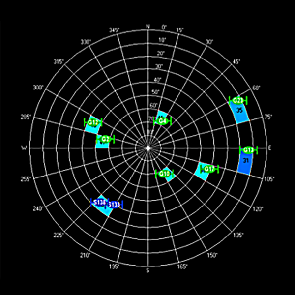 The corresponding sky view and instant C/No values are shown in Fig. 13 and 14. In general, as the value of C/No increases, a larger number of satellites can be visualized.